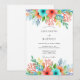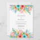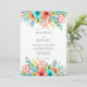A vibrant watercolor design features a cascade of coral, aqua, and yellow blooms with delicate green foliage. The artistic style evokes a playful yet elegant mood, perfect for a spring or summer occasion.