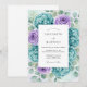 This serene design features a lush arrangement of watercolor teal hydrangeas and soft lavender roses. Delicate silver dollar eucalyptus leaves and subtle gold foliage accents create a sophisticated botanical atmosphere. The airy palette of cool tones evokes a refreshing and elegant mood for a formal or outdoor event.