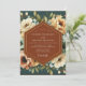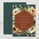 Evoke a sense of moody romance with this elegant artistic design. A stunning bouquet of lush cream and peach peonies blooms against a deep teal background. Touches of light blue and soft green foliage add a delicate contrast, creating a rich, painterly composition perfect for an autumn union.