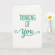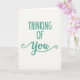This card features a simple three-line message centered on a soft off-white background, with all the lettering in muted teal. The top line reads “THINKING,” set in a plain, modern all-caps style that feels steady and direct. Just below it, “OF” appears in the same teal and matching all-caps style, keeping the layout balanced and calm. The final line, “You,” is larger and more flowing, with gentle curls on the first letter and a smooth tail that lingers like a quiet note of affection ❤️. The contrast between the crisp top lines and the graceful “You” creates the feeling of a close friendship or romance, like someone pausing to choose their words carefully. The teal letters have a faint textured look that adds depth without adding extra decoration 🌼. All three lines are centered with generous spacing, and the word “You” sits slightly lower, drawing the eye to its sweeping curves.