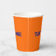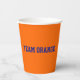 Papiertassen mit orangefarbenem Sockel und dunkelblau, benutzerdefiniertes Textdesign "Team Orange". Es ist jetzt einfach, mit Ihrem eigenen Teamnamen, dem Logo der Stadt usw. zu personalisieren. Design von Alma Wad.