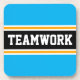 Dieses lustige, sportliche Design beinhaltet sportlichen TEAMWORK-Text in einem farblich hervorgehobenen breiten, schwarzen, horizontalen Mittelstreifen mit doppelweiß und gelb orangefarbenen Rennstreifen gegen leuchtend blaue Außenkanten. Die Farben und Texte in diesem Design können personalisiert sein.