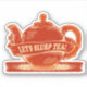Ein lustiges Design für jeden, der Lieben hat, sich mit Freunden zu treffen und Tee zu trinken. Eine Vektorgrafik eines Teekopfes mit einem Band, das um ihn herum gewickelt ist. Der Text auf der Schleife liest, lasst uns zusammenkommen und Tee schlürfen.