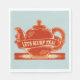 Ein lustiges Design für jeden, der Lieben hat, sich mit Freunden zu treffen und Tee zu trinken. Eine Vektorgrafik eines Teekopfes mit einem Band, das um ihn herum gewickelt ist. Der Text auf der Schleife liest, lasst uns zusammenkommen und Tee schlürfen.