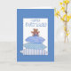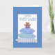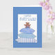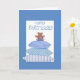 Illustration eines niedlichen kleinen Teddybären auf einem Haufen großer blauer gemusterter Kissen, einer perfekten Geburtstagskarte für Bären-, Spielzeug- oder niedliche Liebhaber!