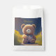 Diese Gefälligkeitstaschen zeigen einen süßen Teddybär inmitten einer Wiese von Blume gegen den Himmel des Abends. Brauner Bär, gelbe Blumen, blauer Himmel. Wunderschöne, individuell gestaltete Fevor Taschen für Babydusche, Kindergeburtstag und mehr! Meine Idee, generiert mit KI.