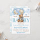 Teddy Bär Babydusche früh warten niedlich Teddy Bär mit Ballons Einladung Vorlage Sofortdownload, Teddy in einer Jacke und Hose mit Haufen Ballons und Wolken blau und braun gedämpfte Farben.