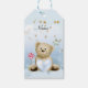 Niedlicher Teddy Bär, der ein Herz auf blauer Wolke mit Sternen hält. Anpassbarer Text vor und zurück. Auswahl der Zeichenfolge.