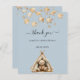 Ein blauer Hintergrund. Sterne und ein Teddybär, der in einem Zelt sitzt, personalisieren und Namen und ein Datum davor hinzufügen. Zurück: Vielen Dank und Namen 1 Blatt = 1 danke Ihnen Karte gedruckt Rand zu Rand.