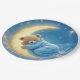 Ein niedlicher Teddybär ist gemütlich in eine blaue Decke eingewickelt und ruht friedlich auf einem leuchtenden Halbmond in einem traumhaften Nachthimmel. Kann für eine Babydusche verwendet werden.