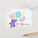 Eine lila Teddybär-Prinzessin, gekleidet in einer hübschen, gelben, juwelenbesetzten Krone und rosa, blaue und grüne Blume tanzt durch die Blume und hält einen Haufen farbenfroher Ballons mit dem Wort GLÜCKLICH auf ihnen. Diese Geburtstagskarte bringt ein Lächeln auf ein spezielles Mädchen zu ihrem 1. Geburtstag. Personalisieren Sie mit ihrem Namen, um es besonders zu machen. Originelles Design von Anura Design Studio.