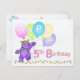 Eine lila Teddybär-Prinzessin, gekleidet in einer hübschen, gelben, juwelenbesetzten Krone und rosa, blaue und grüne Blume tanzt durch die Blume und hält einen Haufen farbenfroher Ballons mit dem Wort GLÜCKLICH auf ihnen. Diese Geburtstagskarte bringt ein Lächeln auf ein spezielles Mädchen zu ihrem 5. Geburtstag. Personalisieren Sie mit ihrem Namen, um es besonders zu machen. Originelles Design von Anura Design Studio.