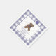 The teddy bear and balloon theme on the napkins allow for customization by adding a name above the "Baby Shower" text. The purple text sits inside a white square with purple border, while the background is a purple and white, buffalo check pattern.