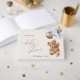 Fügen Sie Ihrer Babydusche mit diesen stilvollen und unvergesslichen Party eine persönliche Touch hinzu! Das Design umfasst einen Teddybär mit blauen Ballons auf beigem Hintergrund.