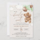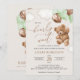 Mit dieser charmanten Babydusche laden Sie Freunde und Familie in Stil und Set zu einem erlebnisreichen Tag ein. Das Design umfasst einen Teddybär mit grünen Ballons auf beigem Hintergrund.