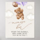 Fügen Sie Ihrer Babydusche mit diesen stilvollen und unvergesslichen Party eine persönliche Touch hinzu! Das Design umfasst einen Teddybär mit lila Ballons auf beigem Hintergrund.
