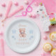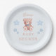 Round paper plates featuring a sweet blue teddy bear and soft blue stars, along with the words Baby Shower. Customizable with the mother's name. Ideal for a baby boy shower.
