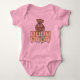 Ein niedlicher Teddybär eines kleinen Mädchens, der auf einem gemütlichen kleinen Strampler blockiert.