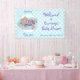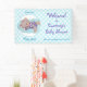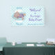 Dieses Banner ist eine gute Möglichkeit, Gäste zu begrüßen, die an Ihrer Babydusche ankommen! Es verfügt über einen hübschen, kleinen braunen Teddybär, der einen lila Schlaf mit goldenen Sternen trägt. Der Babybär schläft auf einer weichen blauen Decke ein. Das Bild ist in einem dünnen blauen Kreis gerahmt, und Set vor einem blauen Gingham wie Hintergrund. Oben und unten befindet sich ein benutzerdefiniertes Textfeld in dunkelblau, und Ihre Informationen sind lila und blau auf der rechten Seite.