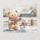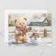 Charming watercolor illustration of a teddy bear creating a snowman in a winter wonderland, capturing the joy of a snowy day. Ideal for seasonal greetings and childrens stories.