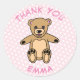 Rosa Dankeschön Geburtstagsaufkleber mit einem niedlichen kleinen Teddybär auf einem rosa Hintergrund mit weißem Polka Punkt Muster, Text Danke und ein Name des Kindes. Es ist perfekt für Kinder Geburtstagsfeiern. Sie können den Aufkleber personalisieren, indem Sie den Namen und den Text ändern.