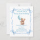 1. Geburtstag Einladung mit einem niedlichen Teddybär, Ballons und Kuchen in sanft hellblau und beige. Niedliches Design für den ersten oder einen Geburtstag eines kleinen Jungen. Personalisieren Sie einfach den gesamten Text einschließlich der Geburtstagsnummer.
