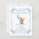 1. Geburtstag Einladung mit einem niedlichen Teddybär, Ballons und Kuchen in sanft hellblau und beige. Niedliches Design für den ersten oder einen Geburtstag eines kleinen Jungen. Personalisieren Sie einfach den gesamten Text einschließlich der Geburtstagsnummer.