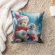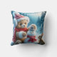 Ein brauner Teddybär in einem Hut, Ohrmuffs und Rotschal baut einen kleinen Schneemann in einem Winterwald, während ein seltsames Kaninchen Uhren