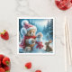 Ein brauner Teddybär in einem Hut, Ohrmuffs und Rotschal baut einen kleinen Schneemann in einem Winterwald, während ein seltsames Kaninchen beobachtet.