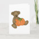 Ein hübscher Halloween-Design-T - Shirt, Tasse, Magnet, Totenbeutel und mehr mit einem braunen Teddybär mit einem großen orangefarbenen Kürbis. Sie können einen Namen oder einen anderen Text zu diesen Halloween-Artikeln hinzufügen, indem Sie das einfache Anpassungstool verwenden!