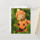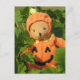 Auf dieser Karte befindet sich ein Foto eines niedlichen kleinen Teddy-Bären, der in einem Kürbiskostüm gekleidet ist. Er ist umgeben von riesigen grünen Blätter in einem Kürbispflaster. Genießen Sie die Halloween- und die Herbstsaison mit diesem niedlichen braunen Bären, der einen sonnigen Herbsttag im Kürbisfleck genießt.