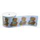 Brauner Teddybär mit blauem Bauch und "füttre mir"-Text auf blauem Hintergrund. Die Hintergrundfarbe kann geändert werden.
