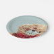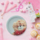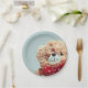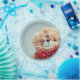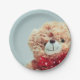 Ein niedlicher Teddybär mit rotem Bogen sitzt gegen einen hellblauen Himmel.