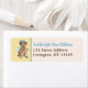 Das Rücksendeetikett koordiniert mit den unten abgebildeten Babyduschen und trägt einen braunen Teddybär, der auf einem Roller reitet, während er eine blaue, rückwärts drehte Kappe trägt und einen gelben, blauen und grünen Ballon mit gelber Hintergrundfarbe trägt. Die Rücksendeadresse ist in Blau und Braun in zwei verschiedenen Schriftart der Einladung gedruckt und auf einem bräunlichen Hintergrund gedruckt.
