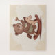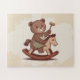 Ein Rätsel mit einer Abbildung eines Holzspielzeugs: ein lächelnder Teddybär, der auf einem rockenden Pferd in warmen Tönen reitet, alles auf einem farbigen Hintergrund: ein nettes Geschenk für ein Kind!