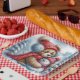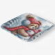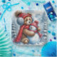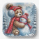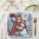 Das Aquarellbild eines knuddeligen Teddybären in rotem Winterkleid verkörpert einen fröhlichen Schneemann in einem verschneiten Wald