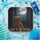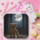 A teddy bear gazes out the window at the full moon, with Santa's sleigh silhouetted against the night sky, as the softly lit room creates a cozy and magical atmosphere
