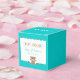 Dieser Babyduschen-Bevorzugungskasten kennzeichnet einen niedlichen braunen Teddybären und einen kundengerechten Text, um danken zu addieren Sie Mitteilung, der Name Mutter-zusein und Duschendatum. Der Hintergrund ist aquamarin, also danken dieser Ihnen, Kasten zu bevorzugen ist perfekt für eine Babydusche für einen Jungen oder ein Mädchen.