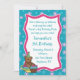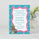 Geburtstag-Party Einladung mit Teddybären in der Teeschale mit kleinem Kuchen. Helle blaue Blumengrenze und rosa Rahmen. Einfach, mit den Details Ihres Ereignisses besonders anzufertigen. Einladungen kommen mit Umschlägen.