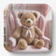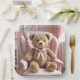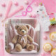 Ein üppiger Teddybär mit rosa Band sitzt bequem auf einem rosa Polsterstuhl in einem leicht beleuchteten Raum