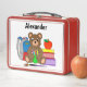 Dies ist eine niedliche Lunchbox für ein Kind in der Vorschule, im Kindergarten oder in der ersten Klasse, um sein Mittagessen zur Schule zu bringen. Das Bild ist ein niedlicher Teddybär, umgeben von Schulmaterial. Diese Lunchbox kann personalisiert werden, indem der Name auf der Lunchbox geändert wird. Das wäre ein großartiges Geschenk von hinten in der Schule.