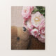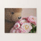 Ein süßer alter Bär braucht Zeit, um einen Strauß von blass rosa Rosen zu riechen