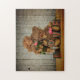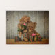 Teddy Bär und eine Puppe mit Buchstabenwort LIEBE vor alter Holzwand mit feiner Textur