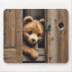 Niedlicher, brauner Teddybär, der in eine alte Türöffnung guckt.