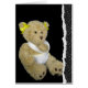 Teddy Bär mit Pfote in einem Tuch auf schwarzem Hintergrund.