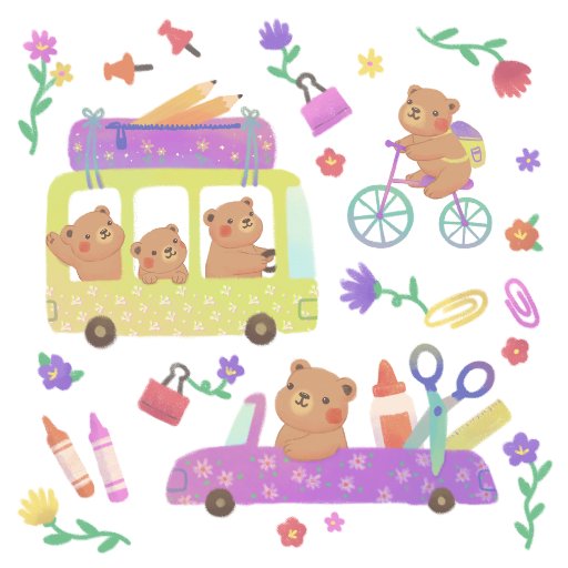 Eine niedliche Abbildung eines Teddybären mit einem Bleistift mit flauschigen Monstern, die andere Schulmaterialien tragen