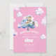 Teddy's First Birthday Sky Safari Einladung Eine skurrile Szene mit einem kuscheligen Bär selbstbewusst navigieren ein Flugzeug durch flauschige Wolken, symbolisiert die Reise eines Kindes im ersten Jahr.