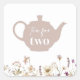 Ein rosa Teekanne mit "Tee für zwei"-Typografie im Inneren, mit zarter Aquarellmalung von Wildblumen am Boden. Ideal für Ihr zweites Geburtstagstee-Party!