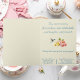 Whimsical Tee Party Karte mit gestapelten Teetassen, Kolibris und blühenden Blumen. Herzlich willkommen!