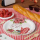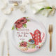 Tee Party Geburtstag personalisierter Name Party Papier Teller Vorlage. Rote Blume, Teekanne mit rotem Polka-Dot, Tasse Tee, Kuchen, Aquarell. Lieblich für jedes Alter.